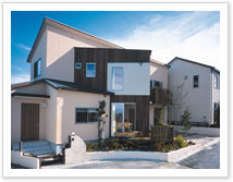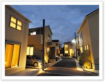 屋根の素材を日本瓦風の物にしたり、暗くなりがちな古い街並みを明るくする為に、お出迎えライト(暗くなると自動点灯する庭灯)を各邸に取り付け夕方頃暗くなると自動的に街並みがやさしい光で包まれるように工夫しました。